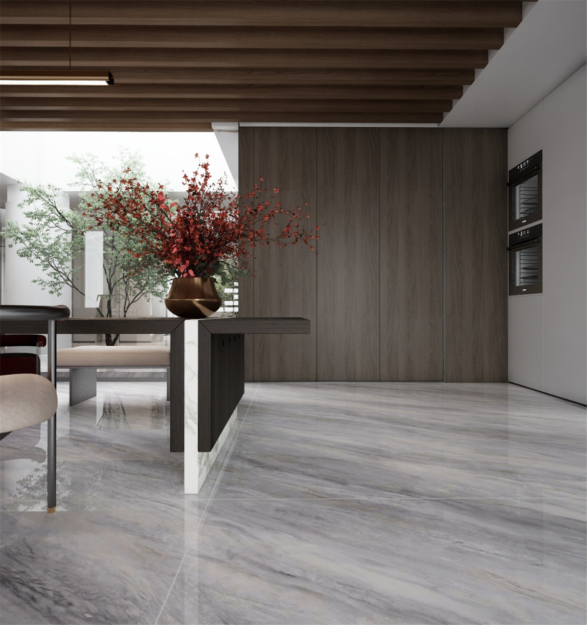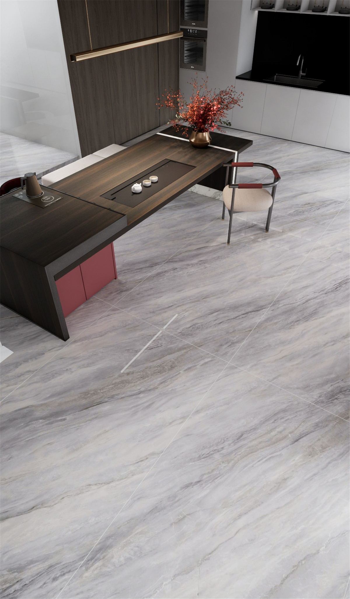 冷冽高級的灰色線性紋理如冰川裂隙般的自然流動感,將浩瀚自然濃縮于方寸,冰川裂隙在暮光中蜿蜒的脈絡,冷玉質感下暗涌著能量,讓空間瞬間化為充滿靈性的自然秘境。